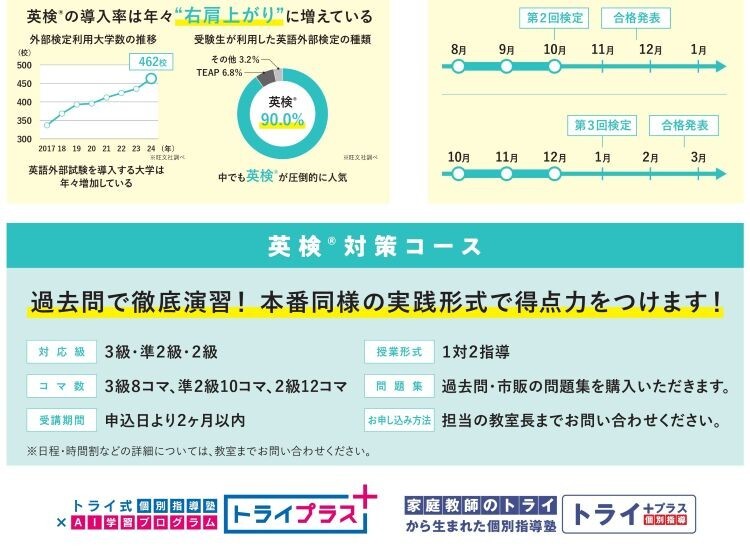 トライプラスでは大学入試の早期化を考慮し、志望校や学部・学科、受験方法に合わせた計画で効率的に学力の向上を図ることが可能です。学校や集団塾とは違い、生徒一人ひとりに合わせたご提案をさせていただきますので、ご家庭でのお悩みを含め、是非お気軽に教室までご相談ください。