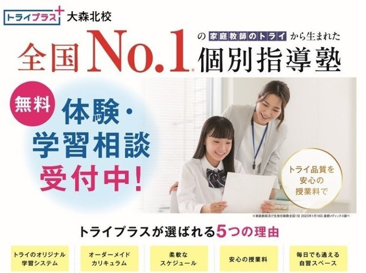 勉強の不安はトライプラス大森北校にお任せください‼いまなら2回分の授業料が無料です。新学年の予習、前学年の復習、最初の実力テストに備えるなどそれぞれの目的にお使いください。