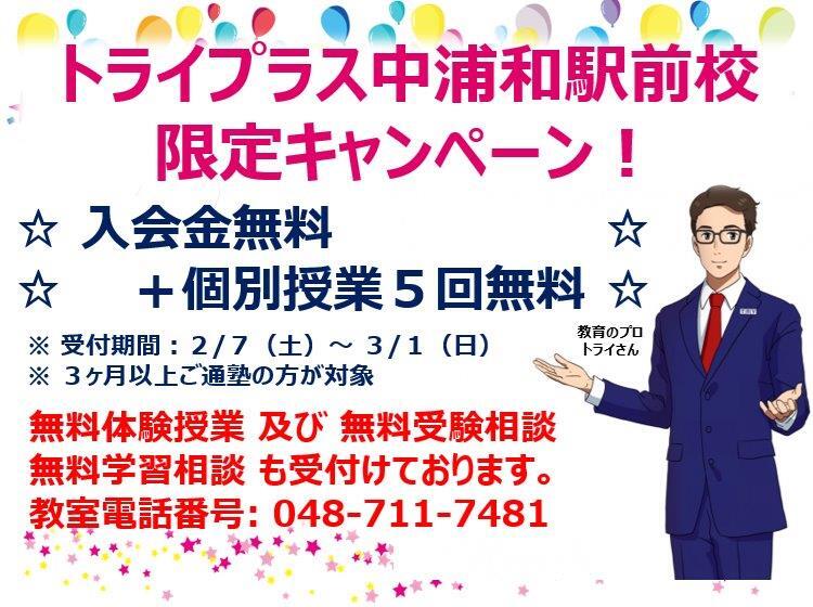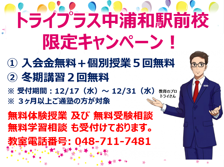 皆様こんにちは。家庭教師のトライでおなじみの個別指導塾トライプラス中浦和駅前校です。 学習に関する目標や悩み・問題は、人それぞれ様々なものがございます。そうした皆様の個々の学習の目標、問題・お悩みに役立つ塾として、一同強力に学習のサポートをしてまいります。 生徒さん一人一人の目標・状況に合わせた指導・サポートにより、学習のお悩みの解決、成績UP・志望校合格という皆様のニーズの実現を図ってゆきます。無料体験授業の他、無料の学習相談・受験相談等もご対応致しております。是非お気軽にお問い合わせ・ご相談下さい。 【教室直通電話番号:048-711-7481】
