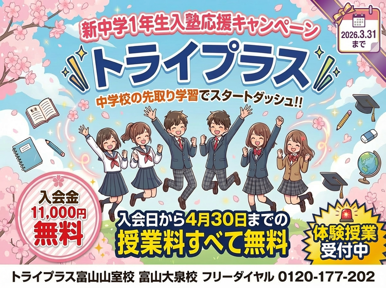 トライプラス富山大泉校ではまだまだ冬期講習の申し込みを受け付けています。この冬から勉強を始めて次の段階の準備をはじめましょう。
