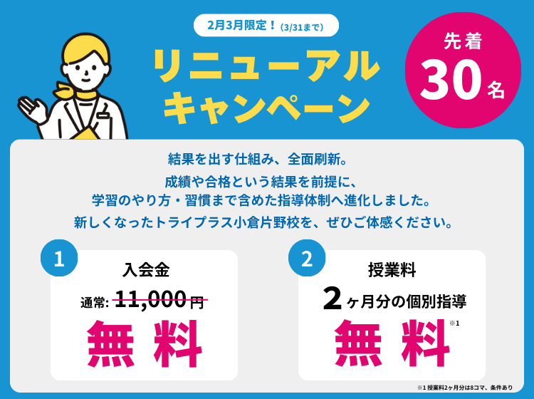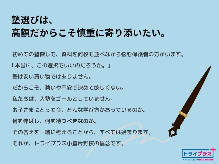北九州市小倉北区のトライプラス小倉片野校では、学年や学校の進度に合わせた個別指導を行います。自分に合った勉強法を身につけ、力を伸ばしませんか。