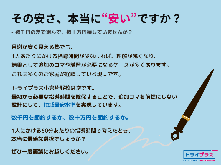 北九州市小倉北区のトライプラス小倉片野校では、学習指導だけでなく、ご家庭での学習サポートについてのご相談にも対応しています。お子さまが前向きに学習に取り組めるよう、一緒に環境づくりを進めていきましょう。