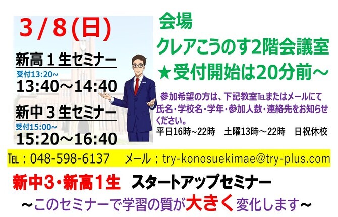 トライプラス鴻巣駅前校では、今年も多くの中3・高3生が志望校合格に向け頑張ってきました。受験ですから蓋を開けてみないと結果は分かりません。しかしながら、多くの場合は合格発表前に結果の予測はつきます。その理由は「受験勉強」=「普段の勉強」だからです。毎日やるべきことは、過去問を解きつつ、できていない単元(問題)を復習して地道に暗記する作業がほとんどです。結局、毎日勉強が続けられるか否かで、受験結果が自ずと見えてきます。試験の結果を左右する最も強力な要因は、受験生の「勉強に向かう心の強さ(モチベーション)」です。 トライプラス鴻巣駅前校では、毎年恒例となりました「高校入試 スタートアップセミナー」を2026年3月8日(日)にクレアこうのすで開催予定です。トライプラス鴻巣駅前校が提供できる価値の一つは「やる気(モチベーション)を育てる環境」だと思います。このセミナーを通して、生徒には「危機感の大切さ」を伝えたいと思います。詳細は来年1月下旬に当HPでお知らせいたします。ご興味ある方は、是非ご参加ください!