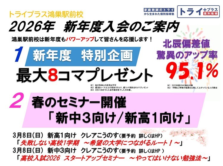 こんにちは。トライプラス鴻巣駅前校です。学年末テストの結果が戻ってきていると思いますがいかがでしょうか。頑張った人、そうでない人、結果はいろいろだと思います。勉強に向かう気持ちが揺れ動いている人は、今が第一歩を踏み出すタイミングです。勉強のモチベーションは、通塾スタートの時期に生まれます。一人でモヤモヤと不安を抱えているのではなく、「なるほど!分かった!」という気持ちで勉強への一歩を踏み出せたら、とっても素晴らしいことだと思います。 トライプラス鴻巣駅前校で実施している春のキャンペーン最大8コマプレゼントの目的は、通塾始めの一番やる気のある時期に、お子様の「苦手単元」を新学期までに丁寧にやり直しておくことです。そこで「わかるようになってきた」感触を感じられたらモチベーションUPにつながります。まさに春からの通塾スタートの大きな価値となります。体験予約お急ぎください!!