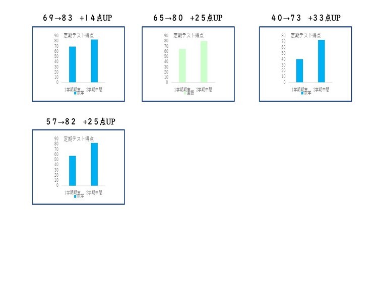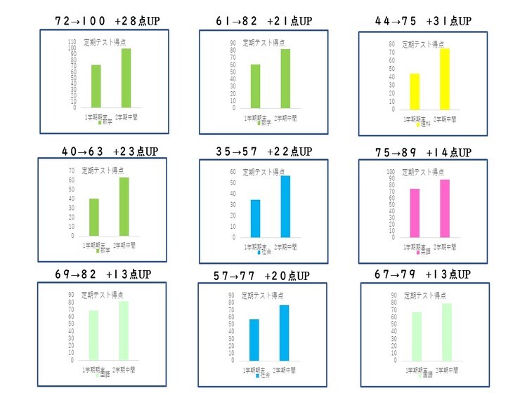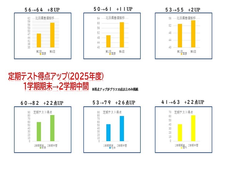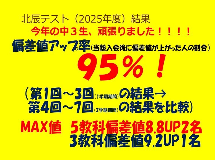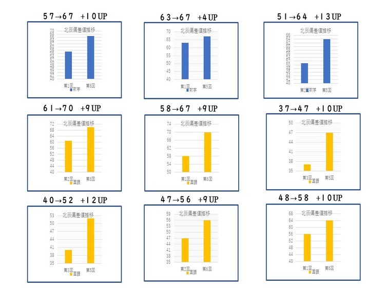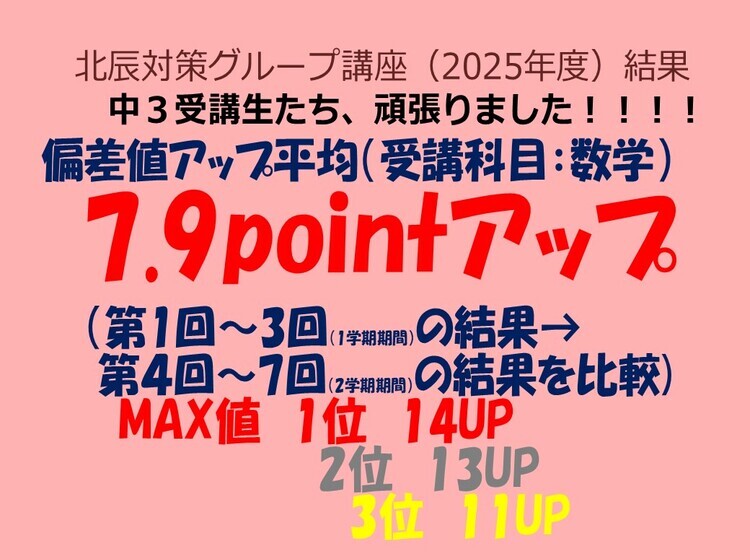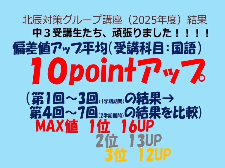 トライプラス鴻巣駅前校では、4月から12月初旬まで毎週土曜日に「北辰対策グループ講座」を開催しています。全32回の国語と数学の授業で中3生対象の講座です。そしてこの講座の受講生は、毎年しっかり偏差値アップしています。限定10名までですが、偏差値アップの平均は数学で7.6、国語で8.9も上昇しています(今年の参加者対象:3年第1回~3回の最低偏差値→第4回~6回最高偏差値の差の平均)。偏差値2桁アップしている生徒もたくさんいるので、本当にこの講座の効果は大きいと感じています。 また、北辰結果だけではなく定期テスト結果もしっかり上がっています!10点以上アップしている人も多く「炎の定期テスト対策システム」を継続していけば入塾前と後ではその差は明確です。そして、勉強を通じて「自信が持てる」という心の変化にもつながっていきます。子供は、親や先生から「期待」されるとやる気がでて伸びていきます。トライプラス鴻巣駅前校は「ほめる」だけの塾ではなく、適度な「期待」を伝えられる塾だから生徒の成績が伸びていくのだと思います。