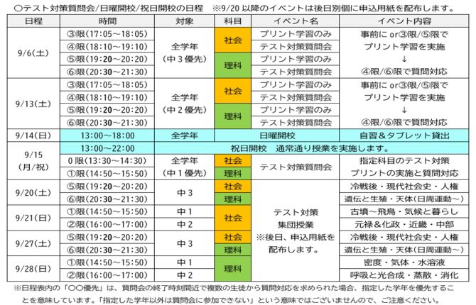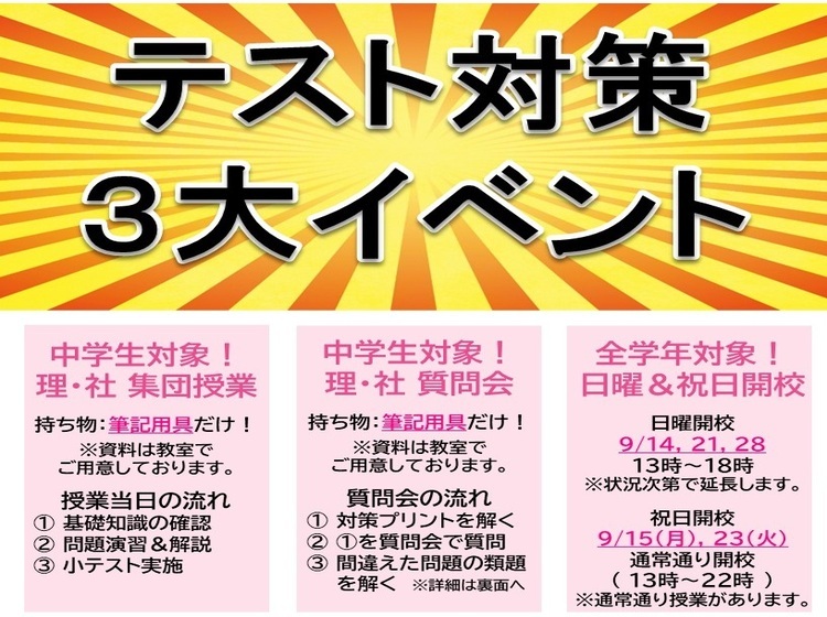 11/2(土)から中学生向けのテスト対策イベントがスタートします。